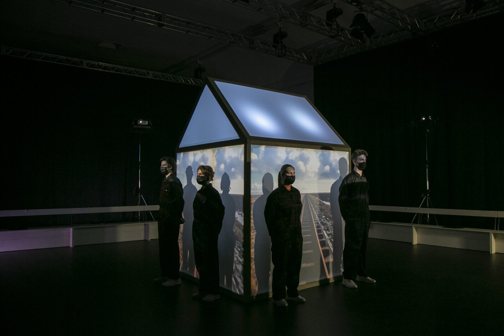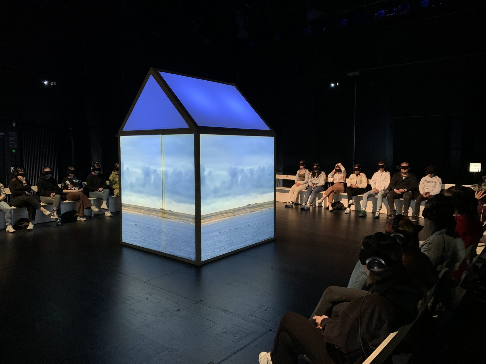 Ausgestattet mit einer schwarzen Augenbinde tauchen die Besucher*innen ins Nichts. Jemand setzt ihnen Kopfhörer auf. Vor dem inneren Auge verschwimmt der reale Raum mit dem akustischen. Die Haut spürt Wind und Wärme. Die Wellen der Nordsee prallen aufs Ohr, tragen die Besucher*innen auf eine einsame Hallig. Dort begegnen sie einem blinden Richter, der einst ein kleiner Junge war mit einer Holzeisenbahn. Gemeinsam treffen sie auf eine unbewältigte Vergangenheit, die wie ein Damoklesschwert über uns hängt. Das Holz knistert im Kamin und die Zeit bleibt stehen, während die Stille zerfließt.